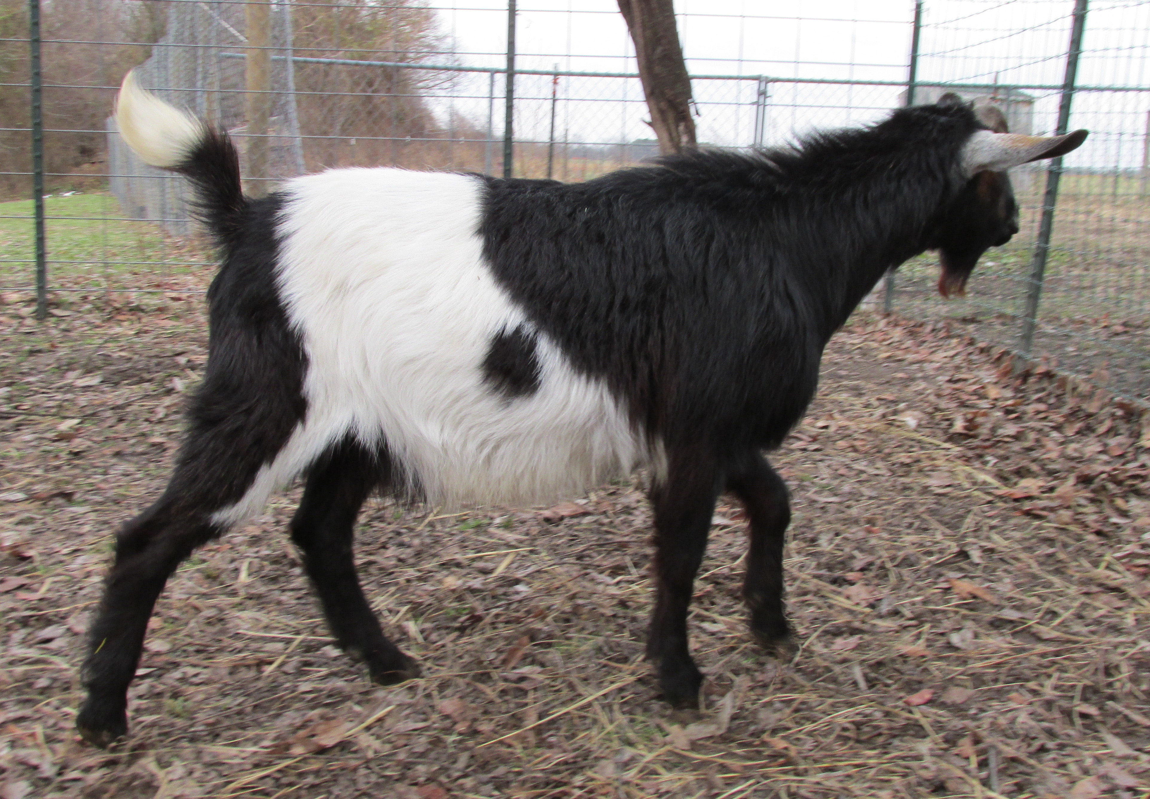Bolt was such a surprise when he came out half white, half black. He was one of the biggest kids I’ve every had, and within just a few minutes he was already up and running around. He’s been big and active since the beginning, and Meg’s babies always grow fast. He is nice and straight, and oh so pretty. He is a descendent of both Lily and Angeliese. Some of our best does. All pictures are as a yearling.